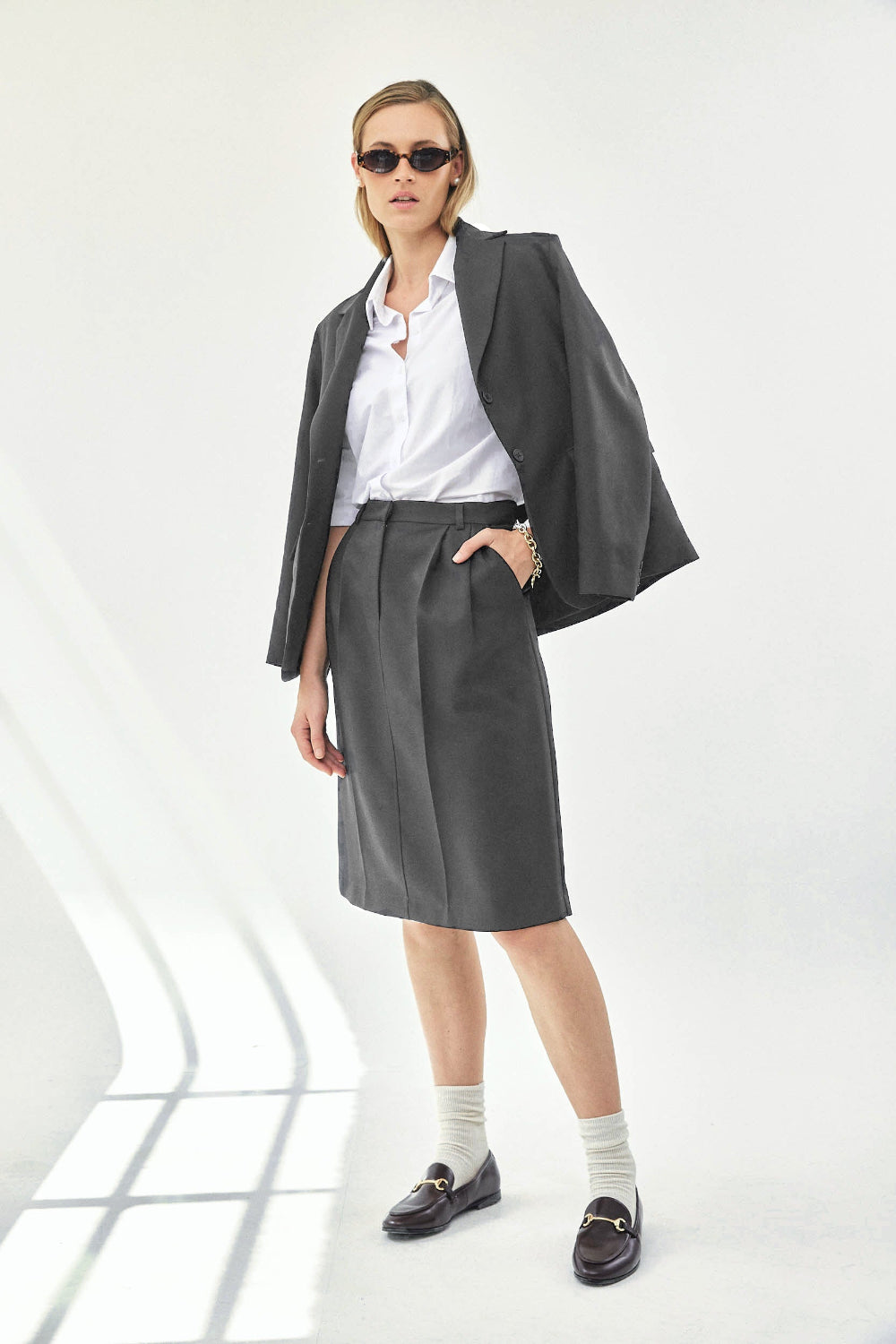 חצאית מחויטת יפהפייה, הגרסה הצנועה למכנסי ברמודה המפורסמים. בגזרה שני קפלים קדמיים מטשטשים ומחמיאים לצד כיסים, רוכסן קדמי עם רכיסה נסתרת, שני דמויי כיסים אחוריים. לחצאית מכפלת של 4 ס"מ.